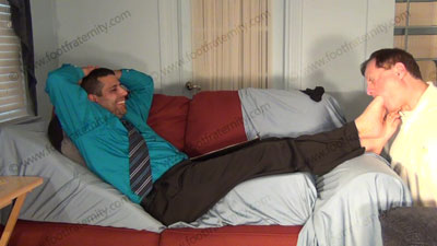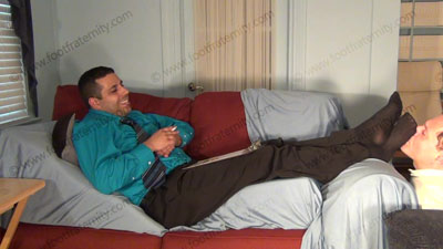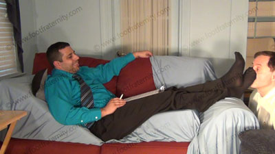In dress shirt, tie, wing tips & thin nylon socks, this hot straight stud is lying on the sofa while slave kneels at his feet to worship & sniff the sweaty socks, then the dirty bare feet; Roberto laughs, knowing that he rules & humiliates slave at his feet ready to be totally embarrassed when the slave is serving his feet: sock and bare foot worship; teases; mocks; gives orders; then humiliates him by allowing him to serve his feet; Roberto is cocky, arrogant and teases about knowing the sissy's need to be at his feet; slave; three camera views (two close ups) & one full length angle. Socks sniffed, kissed; bare feet licked, toes sucked as he is cocky, arrogant and demands the worship.