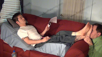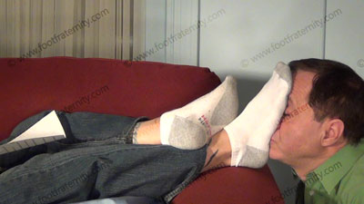 In dress shirt, tie & thin nylon socks, this hot straight stud is lying on the sofa while slave kneels at his feet to worship & sniff the sweaty socks, then the dirty bare feet; slave must make love to Roberto's feet as he ignores him while looking at his magazine; sock and bare foot love making; Roberto is cocky, arrogant as this service happens; four camera views (two close ups) & two hot full length angles. Socks sniffed, kissed; bare feet licked, toes sucked as he is relaxing, arrogant and accepts the love making to his feet.