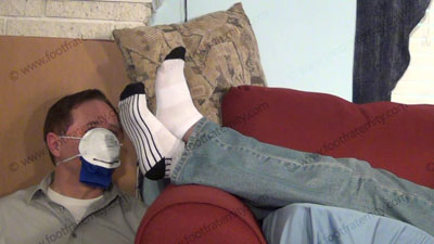 In jeans, T-shirt, sweaty white sport socks with black stripe, this hot straight stud is lying on the sofa while slave must sit at his feet while Roberto uses a mask filled with his sweaty socks at the end which is strapped to slave's face while he forces the bitch to just LOOK at his feet while he reads the current Maxim magazine and flexes his feet. Roberto is cocky, arrogant and teases about knowing the sissy's need to be at his feet; four camera views (two close ups) & two hot full length angles. Socks sniffed in the face mask, eyes not taken off of the perfect macho feet as Roberto is smug and arrogant about being able to do this to a sissy.