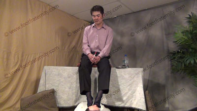 Dress shirt, dress slacks, loafers, sheer to the toe navy dress socks, this hot Korean guy, ChinHo is sitting in on the table with slave on the floor beneath his feet while worship & sniff the sweaty socks, then the sweaty perfectly shaped bare feet; ChinHo laughs, knowing that Straight Guys control & humiliate slaves ready to be totally embarrassed when he has to worship the feet of his Master; Sock and bare foot worship; teases; mocks; gives orders; then humiliates him by allowing him to serve his feet as he dangles them in the slave's face; ChinHo is smart, arrogant and teases; He tells his buddy about being his foot slave; uses him as a foot stool at the end; three camera views (one close up) & two other very sensual angles. Socks sniffed, kissed; bare feet licked, toes sucked - He knows what he is doing!