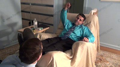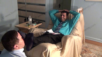 In dress shirt, tie, wing tips & thin blue sheer to toe nylon socks, this hot straight stud is on easy chair with slave on the floor, pinned at his feet while Roberto hypnotizes him into full submission. Sissy serves at his feet to worship & sniff the sweaty socks, then the dirty bare feet; Roberto laughs, knowing that he rules & humiliates slave at his feet ready to be totally embarrassed when the slave is under the spell of his feet: sock and bare foot worship; teases; mocks; gives orders; then humiliates him by allowing him to serve his feet; Roberto is cocky, arrogant and knows & uses the sissy's need to be at his feet; slave; three camera views (one close up) & two hot full length angles. Socks sniffed, kissed; bare feet licked, toes sucked because he is cocky, arrogant and command the worship from his hypnotized slave.