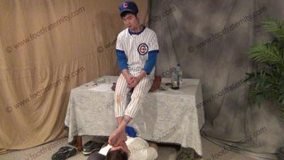 In full baseball uniform with blue Under Armor knee high sweaty baseball socks, this hot Korean guy, ChinHo is sitting in on the table with slave on the floor beneath his feet while worshiping & sniffing the sweaty socks, then the sweaty perfectly shaped bare feet as ChinHo responds to his teammates after they watched the film of him having foot slaves; ChinHo laughs, knowing that Straight Guys control & humiliate sissies ready to be totally embarrassed to worship the feet of his Master; He does "chew" (chewing tobacco and spitting it out); Sock and bare foot worship; teases; mocks; gives orders; then humiliates him by allowing him to serve his feet as he dangles them in the slave's face while talking to the team; ChinHo is smart, arrogant and teases; Socks sniffed, kissed; bare feet worship - He knows how to rule foot slaves!
