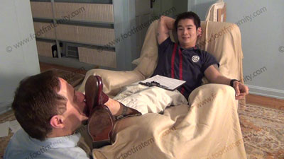 In polo shirt, cordovan Bass Weejun penny loafers this hot straight stud is on easy chair with slave on the floor, pinned at his feet while ChinHo talks on how to rule sissies at a straight guy's feet while wearing just Bass Weejun Penny loafers. First with socks, but mostly with NO socks and the bare feet in the Penny loafers! Four hot views of film angles of this awesome shoe worship as his slave licks & kisses the shoes. Then human foot stool action by macho guys Graham and Roberto who ignore the slave while showing how to use him as a foot stool for their bare feet as they relax. Straight guys deserve this service and worship. three camera views of each.