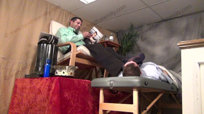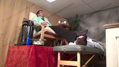 In dress shirt, tie, wing tips & thin blue sheer to toe nylon socks, this hot straight stud is sitting in easy chair on the altar with his slave kneeling at his socked & bare feet while Roberto rules as the God of the church while his sissy serves at his sweaty feet; Roberto commands him, knowing that he rules & humiliates slave at his feet ready to be totally embarrassed by allowing him to serve his God; the slave must worship and obey his God's bare and socked feet; spit many loogies in the face at the end; Then he has slave lay at his feet to worship them and serve as a foot wipe while he looks at his magazines & relaxes with his parish foot stool slave; three camera views (one close up) & two other very sensual angles. Roberto's Church is erotically awesome and in this film, the socked & bare feet are worshipped, massaged & adored with more church ritual for the God's pleasure!