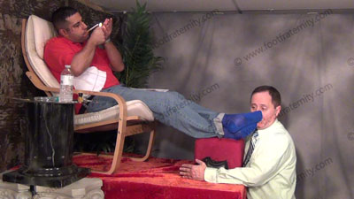 In jeans, polo shirt & blue sheer socks, this hot guy is sitting above his slave in his easy chair with slave kneeling on the floor at his feet while worshipping & sniffing the sweaty socked feet then the sweaty bare feet, as Roberto reads his more fan mail and humiliates the guys who wrote in with their deepest, darkest secrets about being his foot slave; Roberto humiliates his slave & the other sissys ready to be totally embarrassed to worship the feet of his Master; Total socked & bare feet humiliation, adoration & worship; as he teases; mocks; gives orders; then humiliates him by allowing him to serve his feet as he shoves them in the slave's face as he kneels at the superior feet; he mocks, gives verbal abuse & humiliating comments; his feet are shaped perfectly - uses his toes to play with slave's face, nose & mouth; He is arrogant & aloof; three camera views (one close up) & two other very sensual angles.