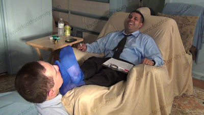 In dress shirt, tie, wing tips & thin blue sheer nylon socks, this hot straight stud is on easy chair with slave on the floor, pinned at his feet while Roberto still has slave worshipping his feet into full submission. Sissy serves at his sweaty bare feet then sniffs the sweaty socked feet; Roberto laughs, knowing that he rules & has power over the slave at his feet who is totally embarrassed when being under the spell of his feet: sock and bare foot worship; He teases; mocks; gives orders; then humiliates him by allowing him to serve his feet; Roberto is cocky, arrogant and knows & uses the sissy's need to be at his feet; three camera views (one close up) & two hot full length angles. Socks sniffed, kissed; bare feet licked, toes sucked because he is cocky, arrogant and commands the worship from his slave again. Slave must shave the hair from Roberto's feet and toes and lick it up to eat it to show his submission in caring for the magnificent feet of this MAN!