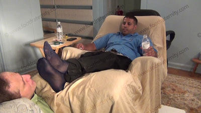 In slacks, blue sheer to toe dress socks for worship; Roberto sitting in lounger as he tells his slave how he plans to tease and humiliate him forever; mocks; gives orders; and commands; he humiliates the sissy as he shows how to dominate and humiliate a foot sissy; he totally teases & mocks with his socked feet for real as he just sits back and watches as he does whatever he wants to his bitch. No script is needed; he dominates, gives orders, humiliates & much more; Roberto is extremely arrogant, cocky & a real prick in how he treats his foot sissys; three camera views (one close up) & two other very sensual angles. The first two thirds is socked foot action, then he relaxes as slave must massage his bare feet for the final third of the scene. He orders the slave to "rub one out" as he makes love to the macho feet as he laughs at him.