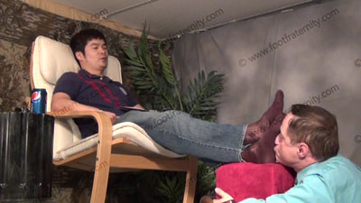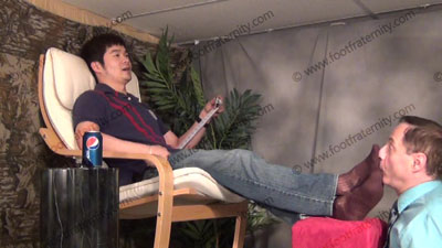 After college classes, Chin Ho sitting on an easy chair on a riser far above with slave kneeling at his feet ready to be totally embarrassed & humiliated as he tells about his power over having foot sissies; sheer brown dress sock and bare foot worship; commands, talk, control, telling all; tease & mocks; gives orders, constant verbal; barefoot worship, nose between toes, kissing; Head used as footstool; respecting the Bass Weejuns; three camera views (one close up) & two other very sensual angles of his hot Korean feet. Chin Ho likes to rule in an intellectual, arrogant manner.