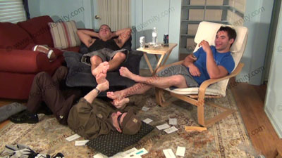 Both jocks are home as a package is delivered. The guys trick him into being their foot slave. Both studs are now bare foot as they open another package to find a hot x film in it! The force delivery guy to be their foot stool and foot licker to the other one as they watch the hot, straight films. All while using the slave to worship, lick, kiss and service their feet as they humiliate their human foot stool and foot slave; serving all 4 socked feet; hot macho verbal straight talk; barefoot worship & service; slave in many positions, then must put the stinky socks back on the studs to serve, sniff and worship the socked feet as they enjoy their film with comments during the scene; then more barefoot worship with delivery man in many positions at the young jocks feet; three camera views (one close up) & two other very sensual angles from the bottoms of their macho, jock feet. They have a great time when they are together and mocking a foot bitch.