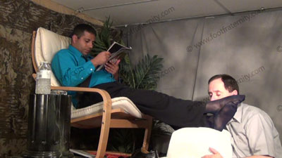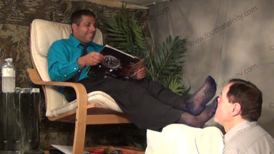 In dress pants, shirt & tie, Roberto is reading his Playboy magazine as slave must shave the hair from his macho feet. The slave must put the blue sheer to toe dress socks on his feet for worship as he continues to read; Roberto sitting in easy chair on riser high above, with slave kneeling at his feet as he just sits back and relaxes as he does whatever he wants as love making is done to his socked and then to his bare feet. He has long bare foot massage combined with foot licking, kissing and toe sucking; three camera views (one close up) & two other very sensual angles. He loves it that he is the king here and we live to make love to his feet.