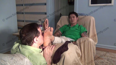 After college classes, Chin Ho, preppy, in Bass Weejun penny loafers, burgundy thick-n-thin sheer socks; sitting on an easy chair with slave at his feet ready to be totally embarrassed & humiliated as he responds about how foot sissies have to treat straight guys. He tells his inner thoughts about this new position to the viewer; his power over having foot sissies; sheer sock and bare foot worship; commands, talk, control, telling all; tease & mocks; gives orders, constant verbal; barefoot worship, nose between toes, kissing; he has tobacco in his mouth as he chews and spits in his bottle thru the scene; three camera views (one close up) & two other very good angles of his hot Korean feet. Total worship to his socked and bare feet thru entire scene.