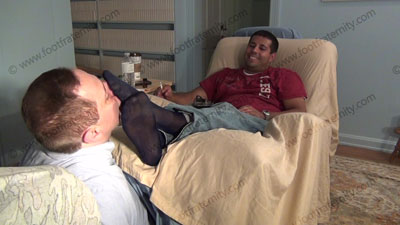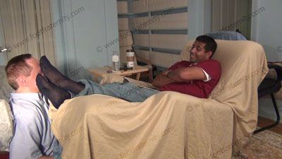 In jeans, Roberto is verbal while sitting in a lounge chair & having his bare feet serviced & worshipped for a few minutes. Then a while is spent on his perfect Latino feet in his smelly sheer to toe dark dress socks; He teases with his socked feet with slave at his feet being totally embarrassed & humiliated; socked feet sniffing, kissing, wiped all over the face, toes over nose; mocks; gives orders; takes more power with his macho socked feet; teases and owns this power; three camera views (one close up) & two other very sensual angles. This Stud really wants to control his foot slaves on a permanent basis. You NEED to believe that this is VERY REAL for him! He wants more slaves at his feet! He loves the worship, power and control.