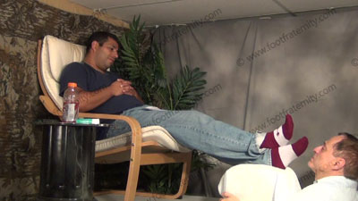 In jeans, shirt, burgundy Under Armor football socks Roberto sitting in easy chair on riser high above, with slave kneeling at his feet as he teases; mocks; gives orders; and commands the bitch to serve him as he reads a very humiliating letter from a priest who is begging to serve Roberto as a god; he humiliates the sissys as the slave kneels before his sweaty socked feet; he totally teases & mocks with his feet for real as he just sits back and watches as he does whatever he wants to his bitch; Roberto is extremely arrogant, cocky & a real prick in how he treats his foot sissys; three camera views (one close up) & two other very sensual angles. He loves it that he has this power over foot sissys. It's all so natural for him to dominate. This is real. He is very sensual with this power and loves looking DOWN at a foot sissy. (no bare feet)