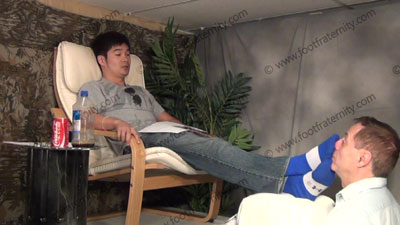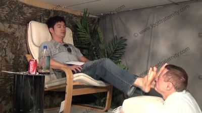 In jeans, T shirt, sneakers, sweaty blue Under Armor football socks; Chin Ho is sitting on an easy chair on a riser far above with slave kneeling at his feet ready to be totally embarrassed & humiliated as he tells about his power over having foot sissies & what has been happening to him so far; sock and bare foot worship; verbal abuse talk; Chin Ho uses chewing tobacco and spits in his bottle; teases; gives orders; rubs socked and then bare feet all over slave's face, toes over nose, slave's head used as a foot stool etc.; three camera views (one close up) & two other very sensual angles. Chin Ho just chills while his feet are worshiped. He is very verbal.