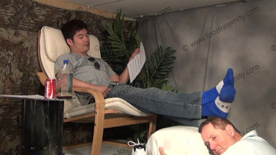 In jeans, T shirt, sneakers, sweaty blue Under Armor football socks; Chin Ho is sitting on an easy chair on a riser far above with slave kneeling at his feet ready to be totally embarrassed & humiliated as he tells about his power over having foot sissies & what has been happening to him so far; sock and bare foot worship; verbal abuse talk; teases; Chin Ho uses chewing tobacco and spits in his bottle; gives orders; rubs socked and then bare feet all over slave's face, toes over nose, slave's head used as a foot stool etc.; three camera views (one close up) & two other very sensual angles. Chin Ho just relaxes while his feet are worshiped. He realizes the power his feet have over us.