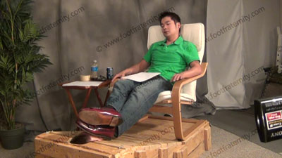 In jeans, Bass tassel loafers, sweaty gold toe dress socks, Preppy Chin Ho (with his hair spiked) has slave locked in the confinement crate as he torments his face with his sweaty socked feet; He torments with his feet in the sissy's face; then does it with his sweaty bare feet in the nose. He talks about being a straight guy who gives orders to slaves; barefoot sniffing, kissing, worship, stands on his face; his macho, Korean attitude of teasing with his feet is completely humiliating; he relaxes and spits his chewing tobacco while chilling at his power & teasing of the sissy trapped in the crate at the mercy of his sweaty socked & bare feet; three camera views (one close up) & two other very sensual angles of his high arched, perfect straight feet.