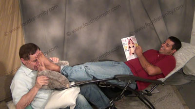 In jeans, sweaty sheer socks, then bare foot action as he has lays back on lounge chair with slave at his feet the whole time to make love to his sweaty socked then bare feet; He ignores him with his feet in the foot lover's face; He says very little, just relaxes and reads, then watches as he sees love making to his macho feet. He relaxes while smoking & taking in his power over foot lovers; three camera views (one close up) & two other very sensual angles of his Latino straight feet. His perfect straight sheer socked and bare feet rule all foot lovers and he KNOWS this and LOVES it.
