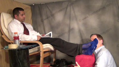 In dress shirt, tie, brogues & thin nylon blue thick-n-thin sheer dress socks, this hot straight stud is sitting above his bitch for worship & sniffing the sweaty socks, (no bare feet) while sissy kneels at his feet the whole time. Roberto laughs, knowing that he rules a priest who wrote him a huge fan letter! He humiliates slave at his feet while making fun of his power with his feet. Pure sheer socked foot worship; teases; mocks; gives orders; then humiliates him by allowing him to serve his feet; Roberto is cocky, arrogant and teases about knowing the this priest's need to be at his feet and worship him; Socks sniffed, kissed; he is cocky, arrogant and demands the worship. He LOVES this power & control of forcing us to kneel at his feet for hours as he is above us! This is so intense and he is flawless as our foot Master.