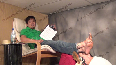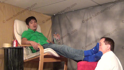 In jean, pull over shirt, soccer shoes & blue Under Armor socks, this hot straight Korean stud is doing a preview interview for the Jerry Springer show and answers the questions that will be asked on TV as he is sitting above his bitch sissy for worship & sniffing the sweaty socks, then his bare feet as he responds, knowing that he rules & humiliates slave beneath his feet to be totally embarrassed when the slave is serving his feet: socked foot worship during the interview. He teases; mocks; gives orders; then humiliates him by allowing him to serve his feet; Chin Ho is cocky, arrogant and teases about knowing the sissy's need to be at his feet; talks about his straight life & having sissies kiss his feet because he is straight; three camera views (two different hot angle full views) & one close up. He is arrogant and cocky as he torments his bitch sissy because he is a straight Master who has his socks sniffed, kissed; then bare feet licked, worshiped while he responds to Jerry and while being cocky, arrogant and demanding. He does "chew" tobacco and spits in a bottle during the interview!