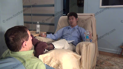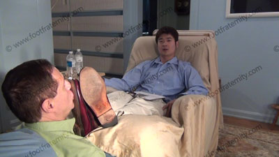 In slacks, nice shirt, thick & thin brown sheer nylon socks, & Bass loafers, this hot straight stud is relaxing on an easy chair with slave at his feet while Chin Ho hypnotizes him into full submission. Sissy serves at his feet to worship & sniff the sweaty socks, then the dirty bare feet; Chin Ho is amused, knowing that he rules & humiliates slave at his feet ready to be totally embarrassed when the slave is under the spell of his feet: sock and bare foot worship; teases; mocks; gives orders; then humiliates him by allowing him to serve his feet; Chin Ho is cocky, arrogant and knows & uses the sissy's need to be at his feet; slave; three camera views (one close up) & two hot full length angles. Socks sniffed, kissed; bare feet worshipped because he is cocky, arrogant and command the worship from his hypnotized slave. He does "chew" tobacco and spits in a bottle during the session.