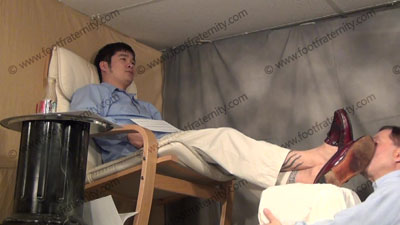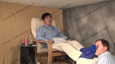 In dress shirt, tie & thin nylon blue sheer dress thick and thin socks, Bass kiltie loafers, this hot straight guy is sitting above his bitch for worship & sniffing the sweaty socks, then bare feet while sissy kneels at his feet the whole time. He laughs, knowing that he rules all sissies who are desperate for his feet! He humiliates his sissy while making fun of his power with his feet. Pure sheer socked foot worship then his Bass loafers are kiss, licked and adored while on his bare feet; teases; mocks; gives orders; then humiliates him by allowing him to serve his shoes; Chin Ho is cocky, arrogant and teases about knowing our need to be at his Bass loafers and feet to worship him; three camera views (two different hot angle full views) & one close up. Socks sniffed, kissed; shoe action while wearing them with no socks; uses slave's head as a foot rest; he is cocky, arrogant and demands the worship. He LOVES this power & control of forcing us to kneel at his feet for hours as he is above us!