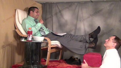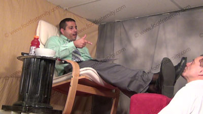In dress shirt, tie, brogues & thin nylon black tux sheer dress socks that he actually wore for his straight marriage, this hot stud is sitting above his bitch for worship & sniffing the sweaty socks, (no bare feet) while sissy kneels at his feet the whole time. Roberto laughs, and brings sissy back into state of hypnosis so he must worship the feet of this Latino god! He humiliates slave at his feet while making fun of his power with his feet. Pure tuxedo socked foot worship; teases; mocks; gives orders, torments; then humiliates him by allowing him to serve his socked feet; Roberto is cocky, arrogant and teases about knowing the slave's need to be at his feet and worship him; three camera views (two different hot angle full views) & one close up. Socks sniffed, kissed; he is cocky, arrogant and expects this worship. He LOVES this power & control of forcing us to kneel at his feet for hours as he is above us! This is so intense and he is flawless as our newly married straight foot Master.