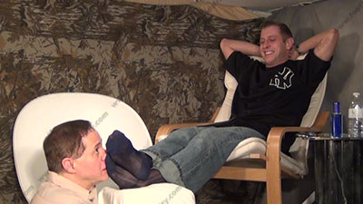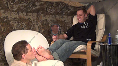 In front of his buddy John, Riley is wearing T shirt, jeans, loafers, sheer cap toe black socks, this hot jock guy, Riley is sitting in his chair with slave at his foot stool at his feet while he reads & responds to his fan letters about having his socked feet worshiped with a racist tease to his slave, then bare feet worship; Riley laughs, knowing that he rules & humiliates his slave who is to be totally embarrassed when Riley reads of how much sissys needs to be at his feet. Sock worship only; He teases; mocks; gives orders; then humiliates him by allowing him to serve his perfect shaped feet; Riley is cocky, arrogant and very intense & into this for real; two camera views (one close up) & one from the bottoms of his feet. Full foot worship & teasing; it all happens as routine for him now that he is accustomed to having foot slaves. He gets sucks in the power. He really does love this worship and control for real as his bitch sissy must obey his every word! Licking toe jam and bare feet; begging him for everything. He really does love this worship and control for real as his bitch sissy must obey his every word! Sniffing & kissing his socked feet; begging him for everything while he humiliates his black slave. He & his buddy laugh as they tease like this and laugh with each other while his feet are served! Then he gets his feet washed in a basin while they laugh.