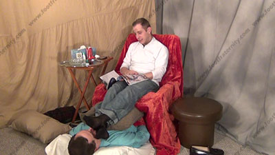In jeans, black loafers & thin black very sheer executive dress cap toe & heel nylon socks, this hot straight stud is sitting with his feet in his slave's face as he tells the rules of serving his feet; this hot straight stud is sitting above his slave who is on the floor beneath his feet as he tells his power over sissys who worship his feet; foot teasing, licking, sucking & worship; Riley laughs and just watches the slave serve his feet while he mocks him and just talks hot verbal humiliation; he teases; mocks; looks at his Playboy mag; and humiliates him in many ways while Riley uses his sweaty bare toes to play with slave's face, nose & mouth; He is arrogant & a extremely macho, cocky and arrogant stud; three camera views (one close up) & two other very hot angles; He teases, mocks & takes foot control over his bitch with total humiliation at his very macho feet, while boasting of his power! Complete foot control.