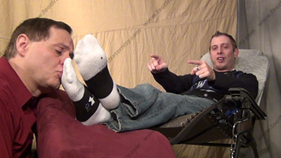 In jeans, sneakers & white Under Armor sports socks, this hot straight stud is sitting back in his lounge chair, telling Dr. Phil all about taking control of his "boss" and making him into his slave with his feet in his slave's face as he tells of his feelings & the slave who is serving his feet; he tells his power & control over sissys who worship his feet; foot teasing, licking, sucking. Riley laughs and just watches the slave serve his socked & bare feet while he mocks him and just tells Dr. Phil of the total foot worship; he teases; mocks; he makes comments about the humiliation; verbal abuse; and humiliates him in many ways while Riley uses his sweaty bare toes to play with slave's face, nose & mouth; He is arrogant & an extremely macho, cocky and arrogant jock; three camera views (one close up) & two other very hot angles; He teases, mocks & takes foot control over his bitch with total humiliation at his very macho socked & bare feet, while knowing he rules with complete foot control over sissys and now shows the world on TV.