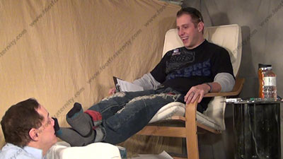 In jeans, black loafers & dark grey dress socks with black cap toes, this hot straight stud is sitting with his feet in his slave's face as he forces him to drink his dirty foot sweaty water that washed his feet. He goes into the power mode for real as this hot straight stud is sitting above his slave who is on the floor kneeling his feet as he tells his power & control over sissys who worship his feet; foot teasing, licking, sucking & worship; Riley laughs and just watches the slave serve his feet while he mocks him and knows how this turns us on for real! He teases; he makes comments about the domination; verbal teasing; and humiliates in many ways while Riley uses his sweaty bare toes to play with slave's face, nose & mouth; He is arrogant & an extremely macho, cocky and arrogant jock; three camera views (one close up) & two other very hot angles; He teases, mocks & takes foot control over his bitch with total humiliation at his very macho feet, while knowing he rules with his straight fantasies. We have found the ultimate, straight foot master of all time!