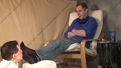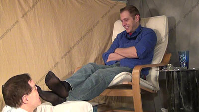 In jeans & black tassel loafers, sweaty sheer cap toe black very sheer socks as this hot straight guy is sitting above his kneeling bitch for worship & sniffing the sweaty socks as he teases, spits and more; His slave is totally embarrassed when while kneeling at and smelling & serving his hot sweaty socked feet then his flawless bare feet; Riley teases; mocks; gives orders; then humiliates him by dominating over slave slaves who must serve his feet Riley is cocky, demanding and teases as he talks about his straight life & having sissys worship, smell & kiss his feet because of this; he tells all while his stud feet are worshipped; he gives orders and commands; three camera views (two different hot full view angles - one from the soles of his feet) & one close up. Socks sniffed, kissed; bare feet licked & kissed as he smokes and humiliates while teasing. He gets "high" and sucks in the power. He really does love this worship and control for real as his bitch sissy must obey his every word! Licking toe jam and bare feet; begging him for this privilege.