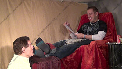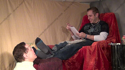 In jeans & sweaty designer crew socks as this hot straight guy walks to his throne on a cash road set up by his sissy slave. He is then is sitting above his kneeling bitch for worship & sniffing the sweaty socks then his perfect shaped bare feet; His slave is totally embarrassed when while kneeling at and smelling & serving his hot sweaty socked feet then perfectly shaped sweaty bare feet; King Riley teases; mocks; gives orders; then humiliates him by dominating over slave slaves who must serve his feet, Slave has a belt strapping his face to the Master's feet as his strong, Alpha hand pulls the face into his feet; Riley is cocky, demanding and teases as he talks about his straight life with confessions from the sissy who worships & smells & kisses his feet because of this; he teases while his stud feet are worshipped; he gives orders and commands; three camera views (two different hot full view angles - one from the soles of his feet) & one close up. Socks sniffed, kissed; socked sniffed & kissed as he humiliates while teasing. The leash is tight, and he doesn't let go! He really does love this worship and control for real as his bitch sissy must obey his every word as he reads the confessions of a foot licker! Licking toe jam and bare feet; begging him to serve his Macho feet!
