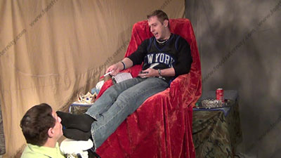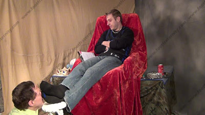 Sport shirt, jeans, sneakers, sweaty black sweaty socks, this hot jock stud, Riley is sitting in his chair with slave at his foot stool at his feet while he talks about the reality here & about having his socked feet worshiped, then bare feet licked & kissed & sniffed by foot sissys; He puts on a crown to remind slave that he is king. Riley laughs, knowing that he knows our dirty secrets & humiliates his slave who is to be totally embarrassed when Riley tells of how much sissys needs to be at his feet. Sock worship then bare foot action; He teases; mocks; gives orders; then humiliates him by allowing him to serve his perfect shaped feet; Riley is cocky, arrogant and very intense & into his Jock power; three camera views (one close up) & two other very sensual angles one from the bottoms of his feet. Full foot worship & teasing; it all happens as routine for him now that he is accustomed to having foot slaves. He really does enjoy this worship and control for real as his bitch sissy must obey his every word! Licking toe jam and bare feet; begging him for everything. Arrogant as ever!