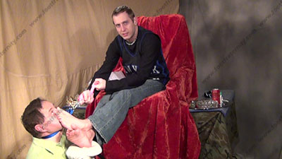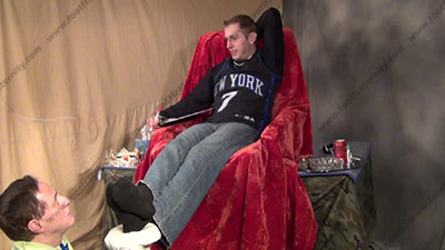 It all continues with him in Sport shirt, jeans, sneakers, sweaty black sweaty socks, this hot jock stud, Riley is sitting in his chair with slave at his foot stool at his feet while he talks about the reality here & about having his socked feet worshiped, then bare feet licked & kissed & sniffed by foot sissys; laughs, knowing that he knows our dirty secrets & humiliates his slave who is to be totally embarrassed when Riley tells of how much sissys needs to be at his feet. He puts his crown back on to feel his power as king. Sock worship then bare foot action; He teases; mocks; gives orders; then humiliates him by allowing him to serve his perfect shaped feet; He loves putting a leash on his dog slave and pulling him into his feet. The Power Rush for him is REAL; makes slave drink water after washing the King's feet; Riley is cocky, arrogant and very intense & into his Jock power; two camera views (one close up) & one other very sensual angle. Full foot worship & teasing; it all happens as routine for him now that he is accustomed to having foot slaves. He really does enjoy this worship and control for real as his bitch sissy must obey his every word! Licking toe jam and bare feet; begging him for everything.