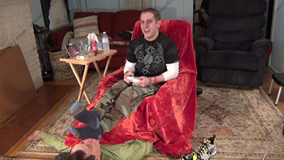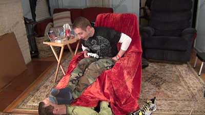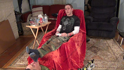 In Air Force pants, sweaty grey work socks with blue cap toe, and sweatshirt as this hot straight stud ignores his foot slave as he plays video games while his slave is serving at his feet. He likes to tease with his socked feet and hold them in the slave's face and ignore him while he is playing the games! He loves this idea to make our place under a straight guy's feet as he relaxes. Riley is sitting on his easy chair with his slave on the floor under his chair & feet for worship & sniffing the sweaty socks as he intently plays this war game making macho comments to the screen which shows his power over slaves; His slave is totally embarrassed when while serving his hot sweaty socked feet while being ignored; the sissy worships, smells & kisses, sniffs his feet; Riley occasionally teases or gives an order or commands; Three camera views (two different hot full view angles - one from the soles of his feet) & one close up. He loves this power & worship more and more as his bitch slaves must obey his every command & accept the power Riley has over him. He laughs at the weakness of foot slaves. He flexes his feet all the time and toys with his slave's face using them when they are wet with sweat.