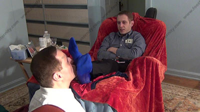 In dress shirt and pants, sweaty blue sheer thick and thin socks as this hot straight stud teases his foot slave as he watches & laughs while his slave is serving at his socked feet. He likes to tease with his sweaty socked feet and hold them in the slave's face and ignore him while he is being interviewed! He loves this idea to make our place under a straight guy's feet as he dominates & teases. Riley is sitting on his lazy boy with his slave pinned at his feet for worship & sniffing the sweaty socks & licking & kissing the bare feet as he gets into the domination, making macho comments to CNN who wishes to interview him about his foot sissy who just married his feet; His slave is totally embarrassed when while serving his hot socked feet while being treated like crap; the sissy worships, smells & kisses, sniffs & worship his feet; Riley teases or gives orders and commands; Three camera views (two different hot full view angles - one from the soles of his feet) & one close up. He loves this power & worship more and more as his bitch slaves must obey his every command & accept the power Riley has over him. CNN asks some hot questions about how Riley got into this power role. He laughs at the weakness of foot slaves & tells all at this interview. He flexes his socked feet all the time and toys with his slave's face using them when they are wet with sweat. Total humiliation.