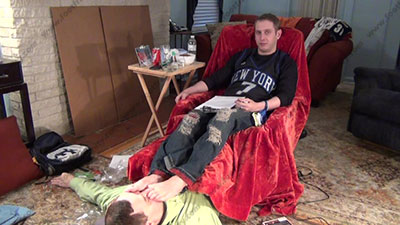 In jeans and sweatshirt as this hot straight stud teases his foot slave as he watches & laughs while his slave is serving at his bare feet. He likes to tease with his sweaty feet and hold them in the slave's face and tease him while he is being in control! He loves this idea to make our place under a straight guy's feet as he dominates & teases. Riley is sitting on his easy chair with his slave beneath it at his feet for worship & sniffing the bare & licking & kissing the feet as he gets into the domination, making macho comments while making fun of foot sissys; His slave is totally embarrassed when while serving his hot bare feet while being treated like crap; the sissy worships, smells & kisses, sniffs & worship his feet; Riley teases or gives orders and commands; Three camera views (two different hot full view angles - one from the soles of his feet) & one close up. He loves this power & worship more and more as his bitch slaves must obey his every command & accept the power Riley has over him. He laughs at the weakness of foot slaves & tells all at this interview. He flexes his feet all the time and toys with his slave's face using them when they are wet with sweat. His feet are perfect.