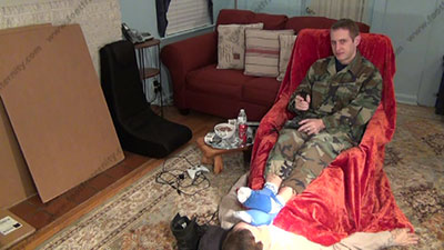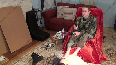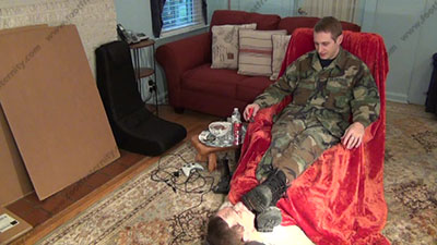 In uniform, sweaty royal blue socks with white cap toes & heels, black lace up boots, as this hot straight stud teases his foot slave as he watches & laughs while his slave is licking his boots for a while ,then socked then bare feet as he uses his joy stick to play a military drill game. He likes to tease with his sweaty feet & bare feet and hold them in the slave's face and tease him while his slave is serving at his feet. He likes to tease with his sweaty socked then bare feet and hold them in the slave's face and laugh at him while he is giving commands, orders & taking power from foot slaves! He loves this idea to make our place under a straight guy's feet as he relaxes in his easy chair with slave underfoot. His slave is totally embarrassed when while serving his Riley's sweaty bare feet & being treated like crap; the sissy worships, smells & kisses, sniffs & worship his feet; Riley teases or gives some orders and commands while playing; Three camera views (two different hot full view angles - one from the soles of his feet) & one close up. He loves this power & worship more and more as his bitch slaves must obey his every command & accept the power Riley has over him. He laughs at the weakness of foot slaves. He loves this life!
