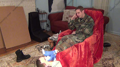 In uniform, sweaty royal blue socks with white cap toes & heels, black lace up boots, as this hot straight stud teases his foot slave as he watches & laughs while his slave does socked then bare feet worship as he teases him and taunts him. Later he uses his joy stick to play a military drill game. He likes to tease with his sweaty feet & bare feet and hold them in the slave's face and tease him while his slave is serving at his feet. He likes to tease with his sweaty socked then bare feet and hold them in the slave's face and laugh at him while he is giving commands, orders & taking power from foot slaves! He loves this idea to make our place under a straight guy's feet as he relaxes in his easy chair with slave underfoot. His slave is totally embarrassed when while serving his Riley's sweaty bare feet & being treated like crap; the sissy worships, smells & kisses, sniffs & worship his feet; Riley teases or gives some orders and commands while playing; (two different hot view angles - one from the soles of his feet & one close up. He loves this power & worship more and more as his bitch slaves must obey his every command & accept the power Riley has over him. He laughs at the weakness of foot slaves. A mix of chillin' and domination while just watching the slave beneath his feet!