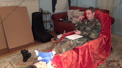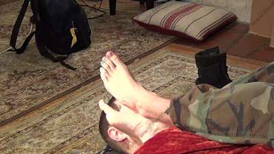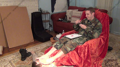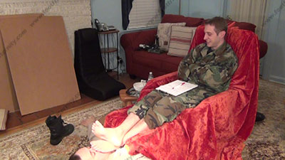 In uniform, sweaty royal blue socks with white cap toes & heels, black lace up boots, as this hot straight stud teases his foot slave as he watches, teases, controls & laughs while his slave does socked then bare feet worship as he teases him and taunts him. He likes to tease with his sweaty feet & bare feet and hold them in the slave's face and tease him while his slave is serving at his Air Force feet. He likes to tease with his sweaty socked then bare feet and hold them in the slave's face and laugh at him while he is giving commands, orders & taking power from foot slaves! He loves this idea to make our place under a straight guy's feet as he relaxes in his easy chair with slave underfoot. Spit, humiliation and more; His slave is totally embarrassed when while serving his Riley's sweaty bare feet & being treated this way; the sissy worships, smells & kisses, sniffs & worship his feet; Riley teases or gives orders and commands while mocking him; (two different hot view angles - one from the soles of his feet & one close up.) He loves this power & worship more and more as his bitch slaves must obey his every command & accept the power Riley has over him. He laughs at the weakness of foot slaves. A mix of talking and domination while just watching the slave beneath his feet! He is getting more ideas of how to take over!