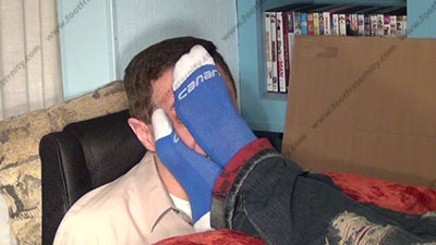 In jeans, Riley has his sweaty blue work out short socks with white cap toes & heels worshipped & sniffed and kissed while he humiliates his slave, telling of the confessions of the need to worship & serve a Straight Guy's feet; then sweaty bare foot service by the bitch, Jock Riley blackmails him, forcing him to serve his bare feet, lick 'em, clean between toes and more; He has slave pinned at his feet with his face forced to do foot worship. Riley totally embarrasses & humiliates in many ways; slave becomes Riley's bitch; sweaty sock & bare foot worship; teases; ashes; spit; mocks; gives orders & talks about the power; then takes slave's dignity as this Golden Blonde Military Stud humiliates & controls; with total blackmail & humiliation with much teasing & laughter at the situation; three camera views (one close up) & two other very sensual full angles - one from the bottoms of his Straight feet. This is More real than you think as he tells why!