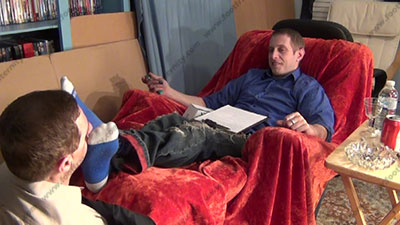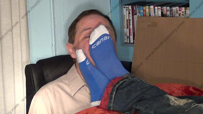 In jeans, Riley has his sweaty blue work out short socks with white cap toes & heels worshipped & sniffed and kissed while he humiliates his slave, telling of the truth of the sissy's need to worship & serve a Straight Guy's feet; then sweaty bare foot service, Jock Riley teases him, forcing him to serve his sweaty socks, then his perfect bare feet, lick 'em, clean between toes and more; He has slave pinned at his feet with his face forced to do total foot worship. Riley totally embarrasses & humiliates in many ways; slave remains Riley's bitch; sweaty sock & bare foot worship; teases; ashes; spit; mocks; gives orders & talks about the power; then takes slave's dignity as this Golden Military Stud humiliates & controls; with total teasing & humiliation with much mocking & laughter at the situation; three camera views (one close up) & two other very sensual full angles - one from the bottoms of his Straight feet. Neither one can stop this power trip.
