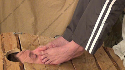 In running pants, this stud has his foot slave locked in the box for bare foot worship, while the slave’s face is locked in position beneath the feet of Riley who is sitting above him. Slave must worship the straight stud's socked feet as he talks; spits in his mouth, stands on his face; mocks; & commands his slave who is weak to the straight feet; licking sweaty bare toes and between them; smoking; three camera views (one close up) & two other very sensual angles. Hot erotic bare foot action during this time as Riley's straight feet are worshiped. His Powerful teasing ways of taunting foot sissys is real. He loves this adoration and teases the sissy for their foot licking, humiliating desires.