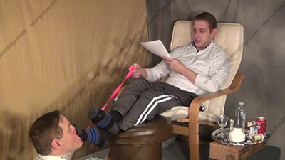 In sweater, slacks, designer crew gray/blue socks, Riley is chillin’ sitting up with his feet on a foot stool & slave kneeling at his feet ready to be totally embarrassed & humiliated as he shows how to humiliate foot slaves while slave is kissing the feet, adoring socked toes, smelling them, worshipping the straight stud's socked feet as he talks; puts a dog leash on him; mocks; & commands his slave who is kneeling at the straight feet; first sock action, then licking sweaty bare toes and between them; smoking & forcing slave to humiliate himself with foot worship of this straight stud; three camera views (one close up) & two other very sensual angles. Hot erotic foot action during this time as Riley's straight feet are served. His Powerful teasing ways of taunting foot sissys is real. He loves this adoration and teases the sissy for their foot licking, humiliating ways.