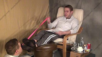 In sweater, slacks, black thin nylon socks, Riley is chillin’ sitting up with his feet on a foot stool & slave kneeling at his feet ready to be totally embarrassed & humiliated as he shows how to humiliate foot slaves while slave is kissing the feet, adoring socked toes, smelling them, worshiping the straight stud's socked feet as he talks; puts a dog leash on him; mocks; & commands his slave who is kneeling at the straight feet; first sock action, smoking & forcing slave to humiliate himself with foot worship of this straight stud; three camera views (one close up) & two other very sensual angles. Hot erotic socked foot action during this time as Riley's straight feet are served. His Powerful teasing ways of taunting foot sissys is real. He loves this adoration and teases the sissy for their foot licking, humiliating needs.