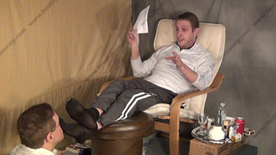 In sweater, slacks, black thin nylon socks, Riley is chillin’ sitting up with his feet on a foot stool & slave kneeling at his feet ready to be totally embarrassed & humiliated as he shows how to humiliate foot slaves while slave is kissing the feet, adoring socked toes, smelling them, worshipping the straight stud's socked feet as he talks; puts a dog leash on him; mocks; & commands his slave who is kneeling at the straight feet; first sock action, then licking sweaty bare toes and between them; smoking & forcing slave to humiliate himself with foot worship of this straight stud; three camera views (one close up) & two other very sensual angles. Hot erotic foot action during this time as Riley's straight feet are served. His Powerful teasing ways of taunting foot sissys is real. He loves this adoration and teases the sissy for their foot licking, humiliating desires.