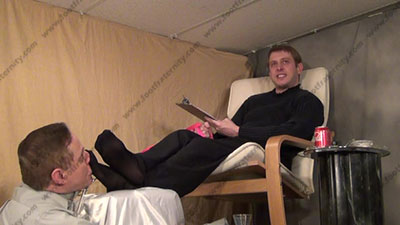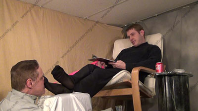 In sweater, slacks, dark nylon dress socks, Riley is chillin’ sitting up with his feet on a foot stool & slave kneeling at his feet ready to be totally embarrassed & humiliated while sissy is kissing the socked feet, adoring socked toes, smelling them, worshiping the straight stud's socked feet; only sock action, smoking & forcing slave to humiliate himself with foot worship of this straight stud; putting a dog collar on the sissy, and more humiliation; three camera views (one close up) & two other very sensual angles. Hot erotic foot action during this time as Riley's straight socked feet are served. His Powerful teasing ways of taunting foot sissys is real. He loves this adoration and teases the sissy for their foot licking, humiliating desires and doing it for real!