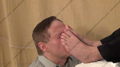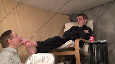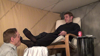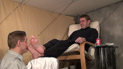 In sweater, slacks, dark thin nylon dress socks, Riley is chillin’ sitting up with his feet on a foot stool & slave kneeling at his feet ready to be totally embarrassed & humiliated as he talks to his slave while slave is kissing the feet, adoring socked toes, smelling them, worshiping the straight stud's socked feet, then serves Riley’s bare feet and more humiliation; first sock action, then licking sweaty bare toes and between them; smoking & forcing slave to humiliate himself with foot worship of this straight stud; three camera views (one close up) & two other very sensual angles. Hot erotic foot action during this time as Riley's straight feet are served. His Powerful teasing ways of taunting foot sissys is real. He loves this adoration and teases the sissy for their foot licking for real!