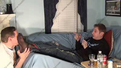In jeans, Air Force sweaty T-shirt, black sheer to toe socks, Riley is lying on sofa with his feet up on the end & slave kneeling at his feet ready to be totally embarrassed & humiliated as he responds to our dirty little needs for his feet, talks about this foot worship scene; he tells how he will continue to humiliate foot slaves while slave is kissing the socked toes, smelling them, worshiping the straight stud's socked feet as he talks; mocks while slave is kneeling at the straight feet; three camera views (one close up) & two other very sensual angles. Hot erotic sock foot action then some bare foot service as Riley's straight feet are served. You hear his comments on just loaded words of power. He lets you all know why he loves teasing and humiliating sissy foot slaves so much and how it will continue. Seeing his flawless feet thru the socks is breathtaking.
