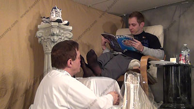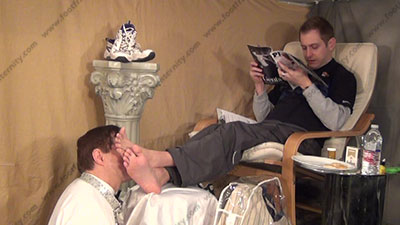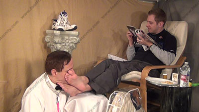 With slave kneeling before the feet of King Riley who is in work out pants and sheer to toe black socks, the bitch continues to serve the feet of this Straight Stud as Riley totally ignores him for the whole time of love making to his bare and socked feet while Riley reads and enjoys Playboy mags. Riley is sitting above his slave with his feet in sissy’s face which are totally worshiped and served and praised for the honor to have married his feet. He ignores the slave and looks at a Playboy mag while his feet are adored; three camera views (one close up) & two other very sensual angles. Hot erotic foot worship during the honeymoon to his feet.